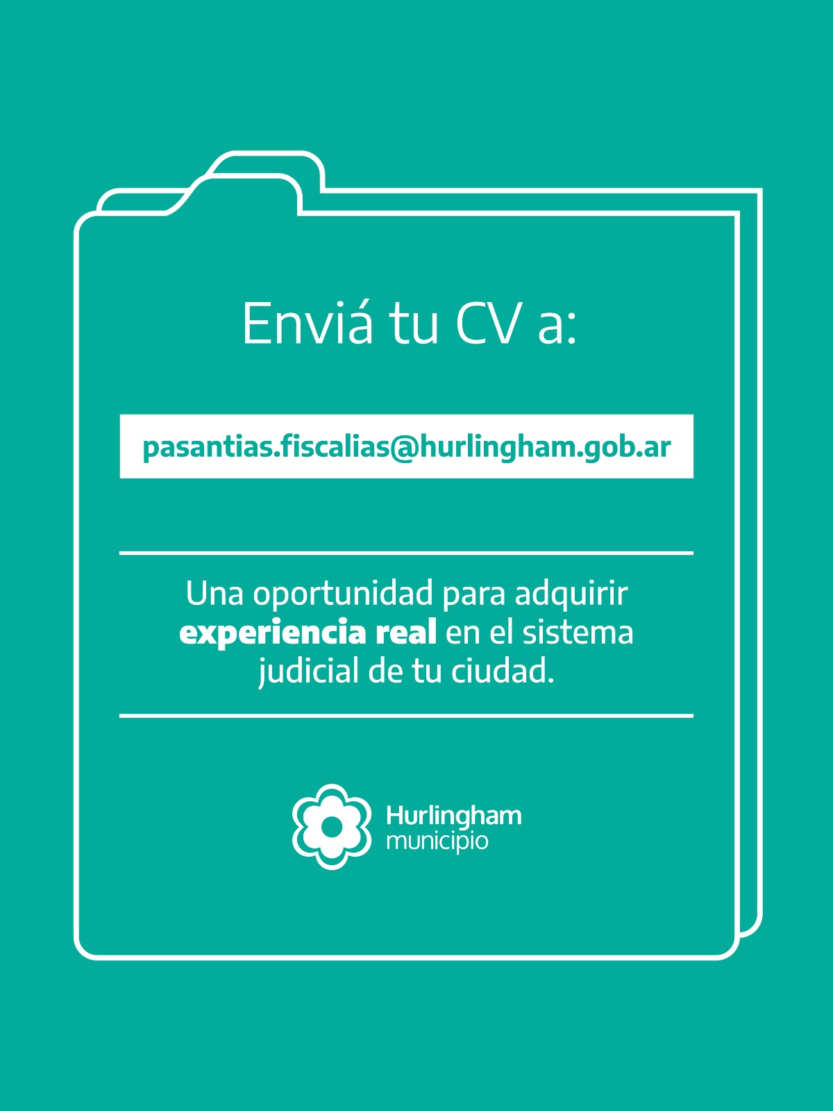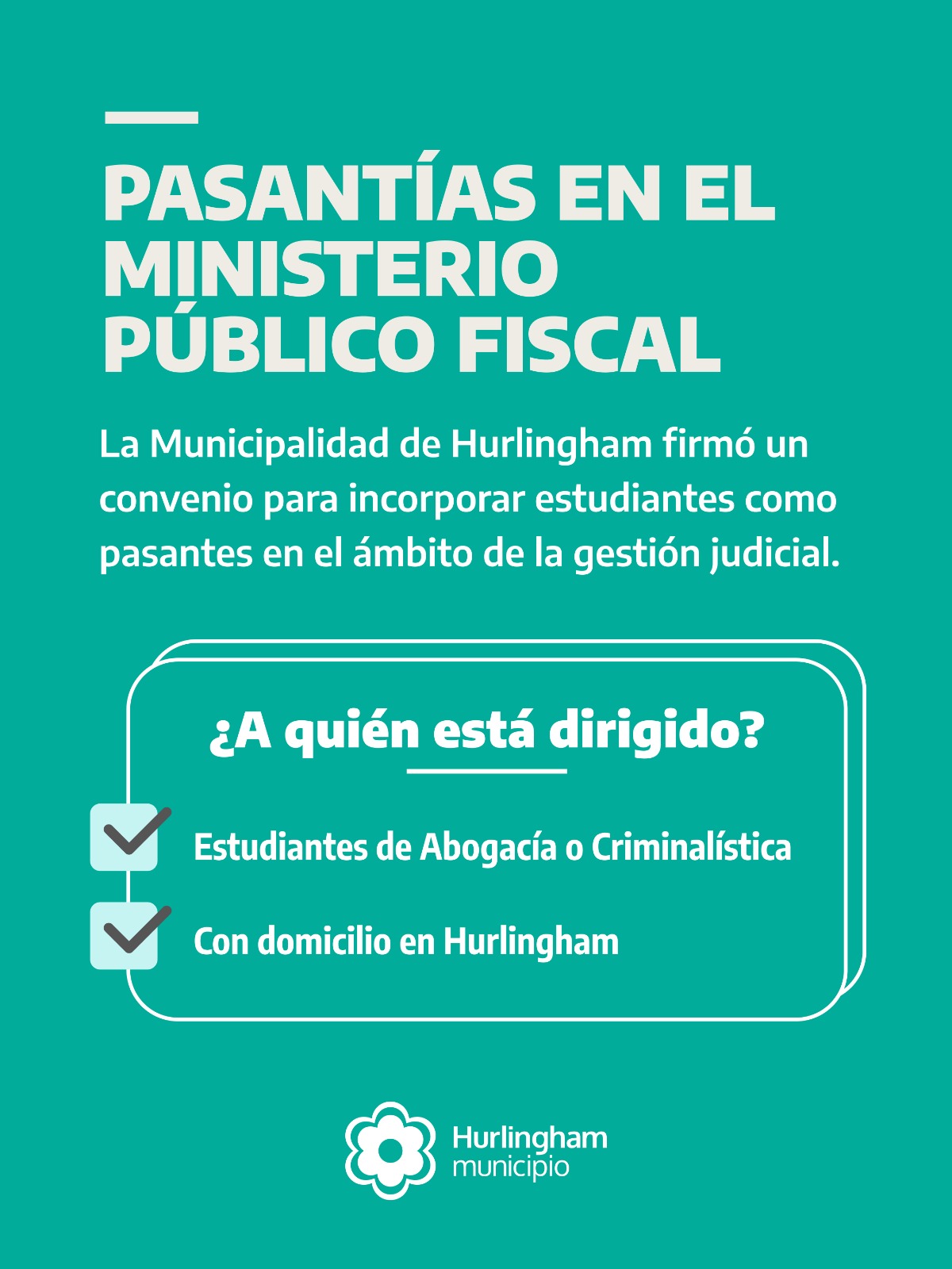 Según informaron, la convocatoria está dirigida a estudiantes de las carreras de Abogacía o Criminalística que residan en Hurlingham. Quienes estén interesados pueden enviar su CV a pasantias.fiscalias@hurlingham.gob.ar.