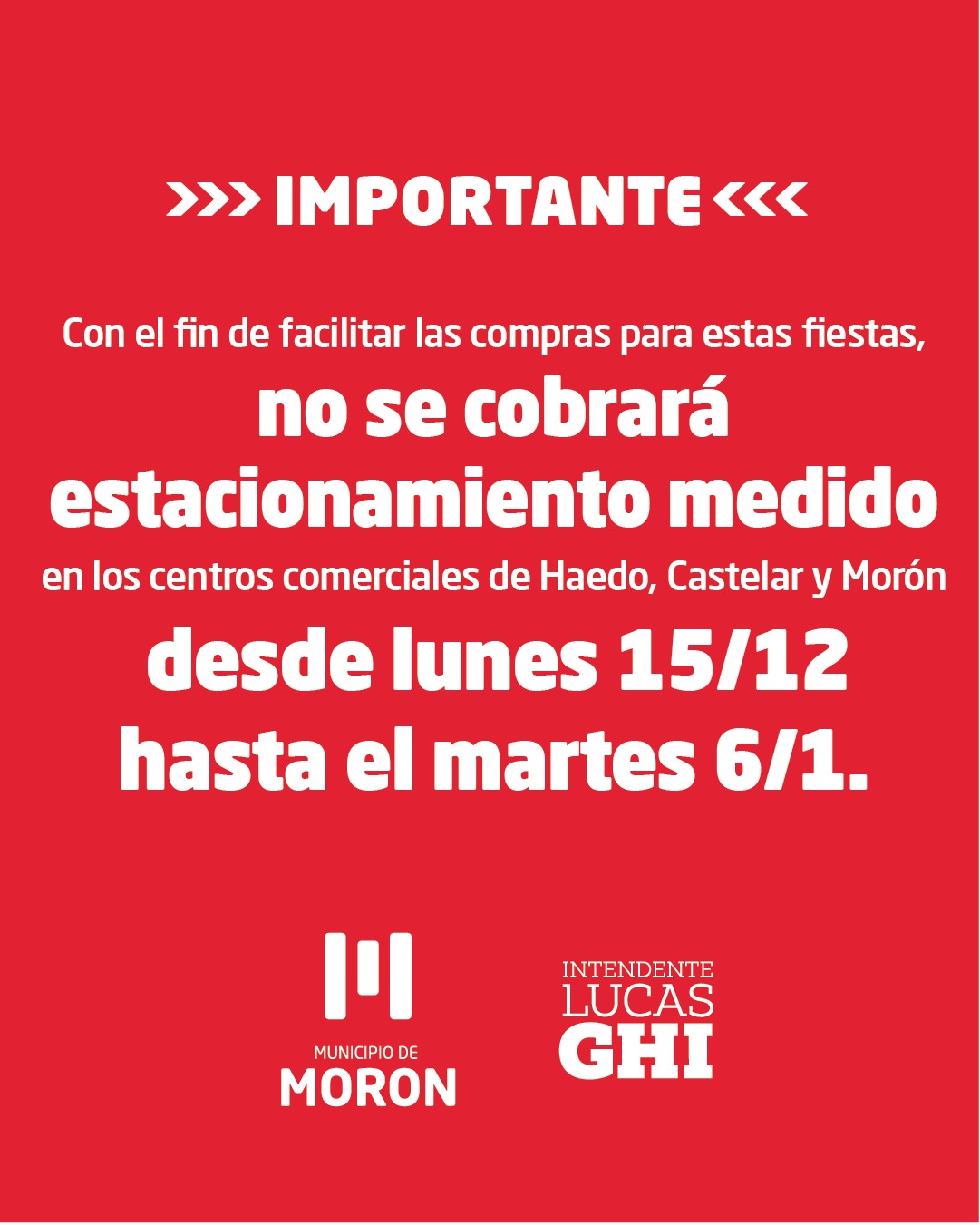 Además, hasta el 6 de enero no se cobrará estacionamiento medido en los centros comerciales de Haedo, Castelar y Morón para fomentar así el comercio local.