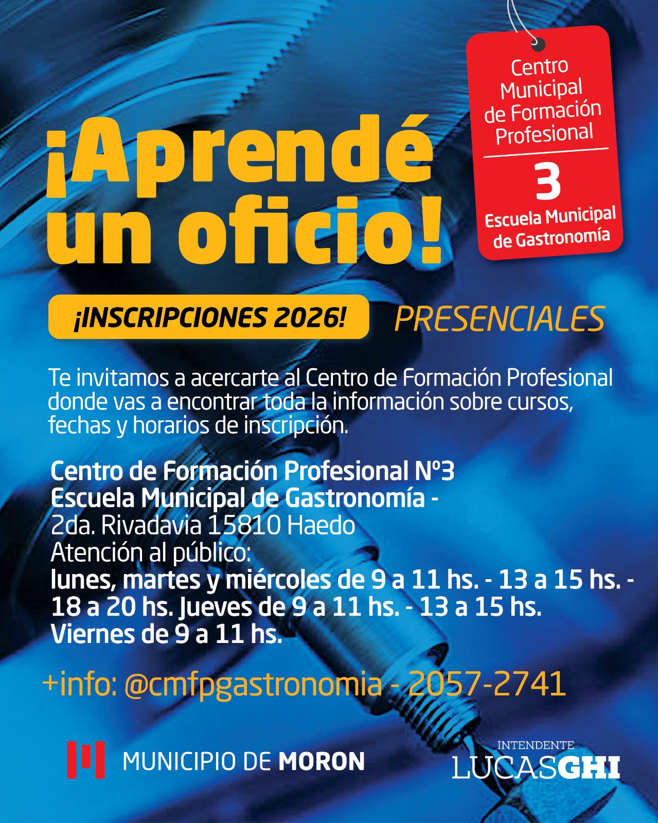 El municipio de Morón promueve una oferta formativa diversa en los Centros de Formación Profesional Ricardo Rojas, Manuel Belgrano y en la Escuela Municipal de Gastronomía de Haedo. Con más de 40 opciones disponibles, donde los vecinos pueden capacitarse en distintos rubros vinculados como la administración, la tecnología, la salud, la estética, la gastronomía, la electricidad, la herrería, el diseño, las energías renovables y demás oficios.