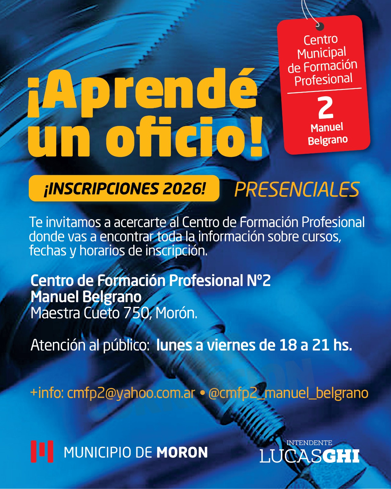 También, el Centro de Formación Profesional Nº2 “Manuel Belgrano” (Maestra Cueto 750, Morón) atiende de lunes a viernes de 18 a 21. Sus vías de contacto son cmfp2@yahoo.com.ar o Instagram @cmfp2_manuel_belgrano.