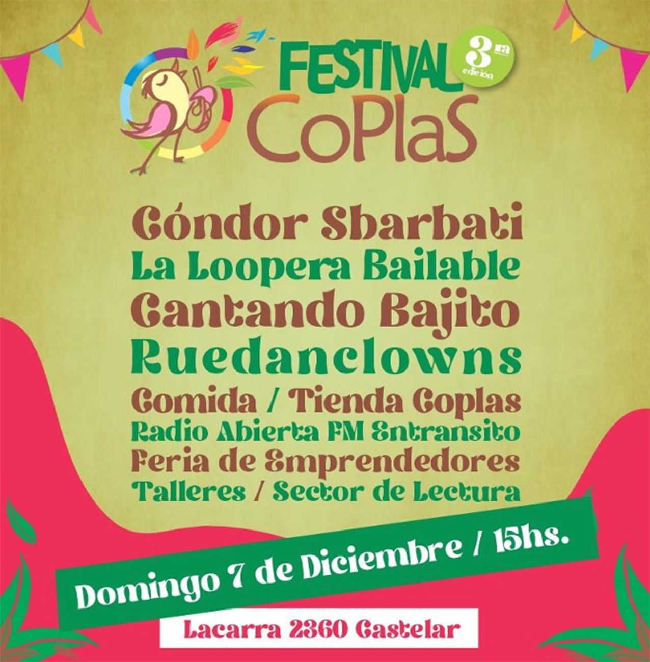 El domingo 7 de diciembre a las 15 se realizará la tercera edición del FESTIVAL CoPlaS, “El Festival de Nuestra Escuela Cooperativa y Sustentable” en la sede de la escuela, Lacarra 2360, Castelar.