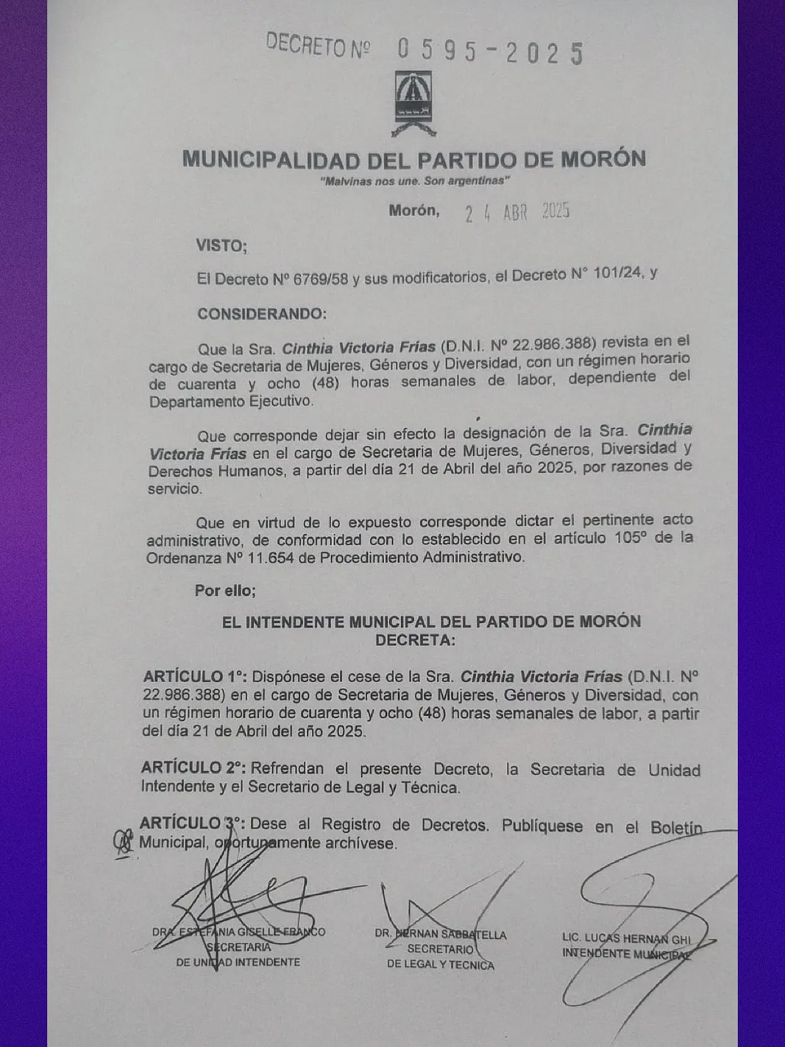 4 de noviembre de 2024: Carta de la Secretaría de Mujeres, Género y Diversidad de Morón al intendente Lucas Ghi, tras la designación como Secretario Legal y Técnico del Municipio de Hernán Sabbatella.
